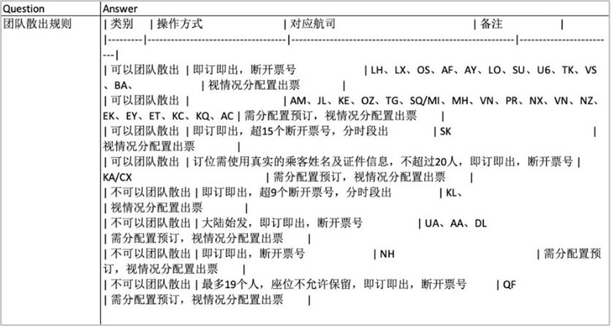 精准检索行业知识:能够从知识库中准确找到指定信息,例如某航司团队票是否可以按散客票出票;