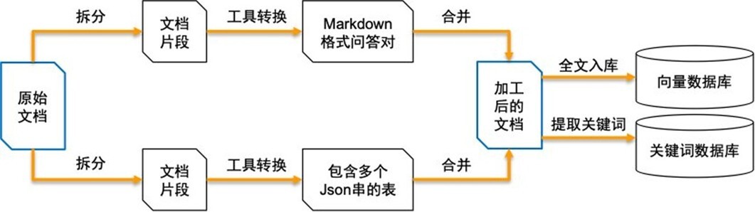 根据经验,将数据按照不同组织形式进行针对性处理,会有效提高知识库问答准确率。数据预处理这一步骤主要的作用是将原始文档按照不同文本形式拆分并转换后,再合并成新的处理后的文档,之后将其内容注入向量数据库,并提取关键词注入关键词数据库,如下图所示: