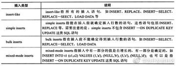 因此 InnoDB 提供了一种轻量级互斥量的自增长实现机制,大大提高了自增长值插入的性能。同时提供了一个参数 innodb_autoinc_lock_mode 来控制自增长的模式,该参数的默认值为 1。了解其实现之前,先对自增长的插入进行分类,如下表: