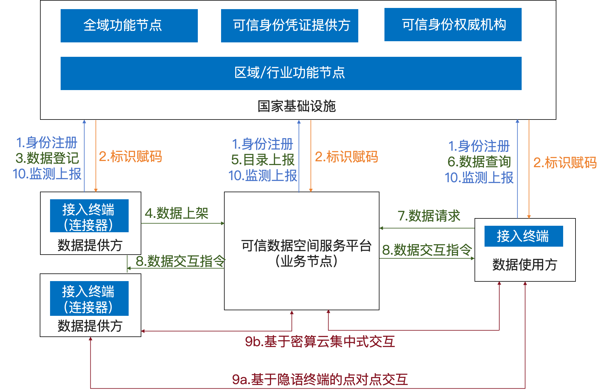 (1)数据登记与获取标识:数据提供方将数据登记到国家基础设施(区域/行业功能节点)之中,获得数据标识。