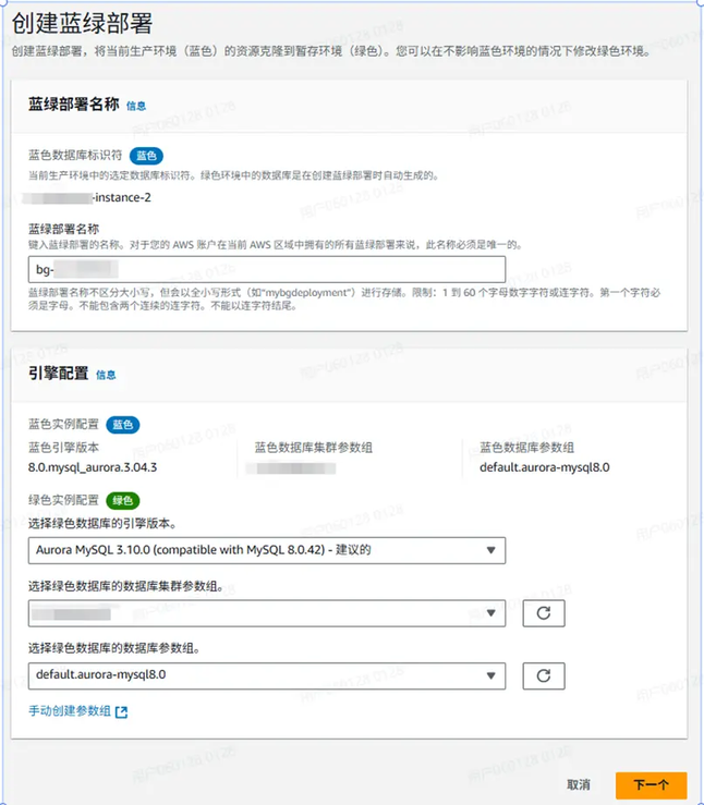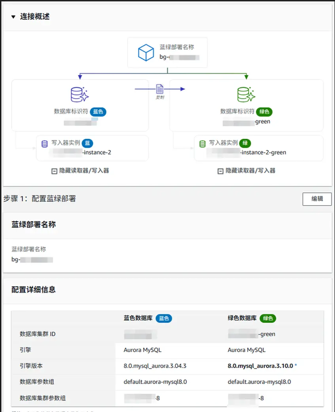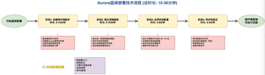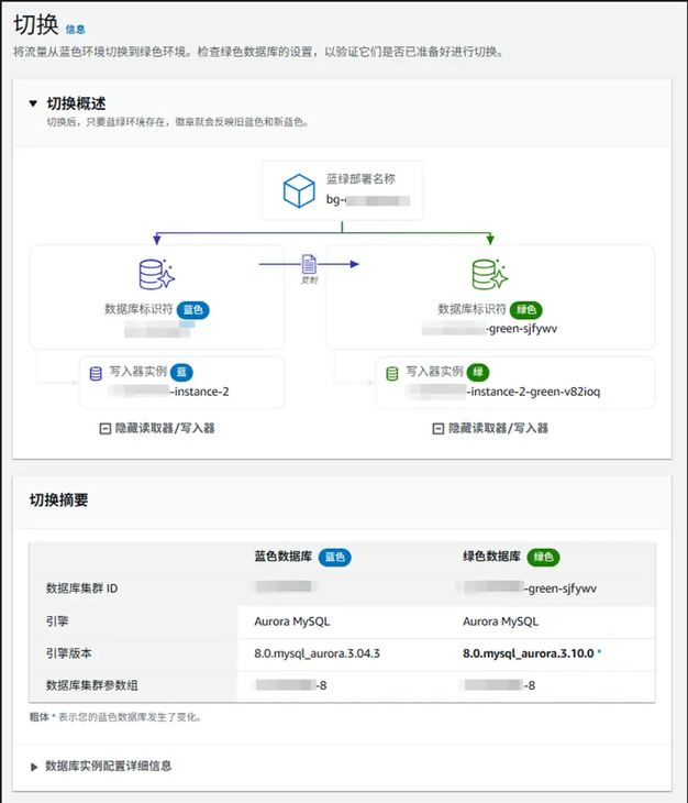 建议方式: 对于升级支持,Aurora 提供了蓝绿部署,它将自动创建绿环境(目标环境),并自动同步数据修改,最终按照指令完成 DNS 指向的切换。。