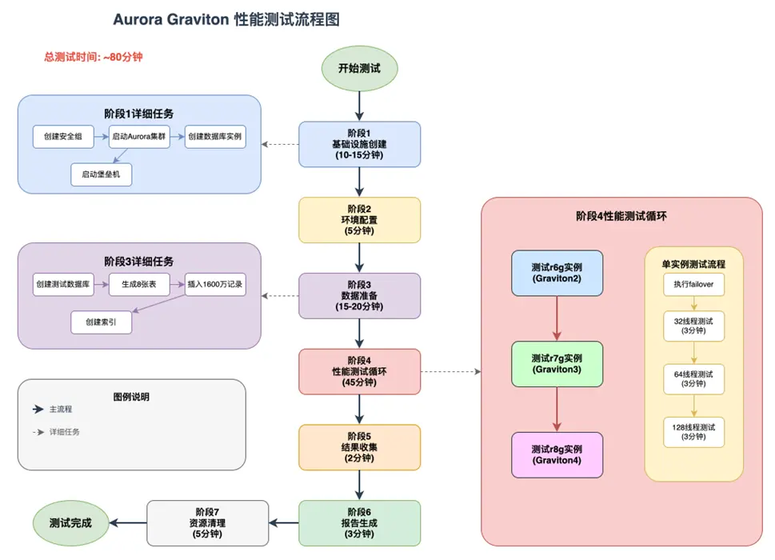 对于本次测试需要测试人员与 Q CLI 紧密协作,因为 Q CLI 还不具备独立完成测试流程制订的能力,需要融合我们在性能测试的许多方法和经验积累。 以下为 Q CLI 根据多次的修改补充后完成的测试计划,并且使用 drawio 格式生成的测试流程图,为了美观总体布局做了少量调整。
