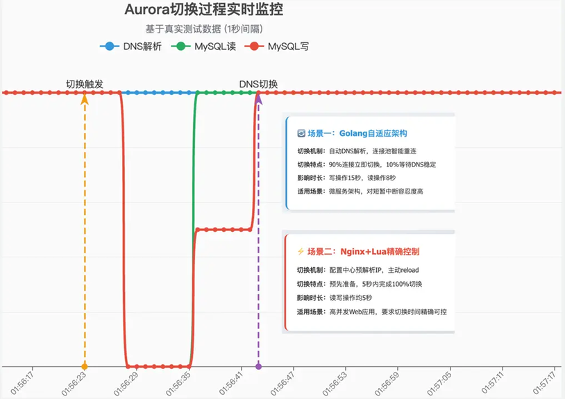 在 Aurora 实例发生切换到 DNS 的 IP 映射真实切换之间,对于写操作都是不可用的,这期间的连接尝试也是无效和;