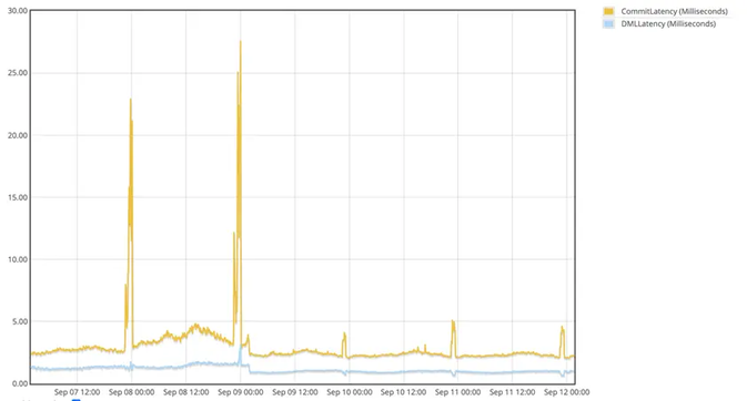对于 DML 延迟也有相当明显的表现,日间最大 DML 延迟从 8 号的 2ms 下降到 1.7ms,下降幅度为 30%。凌晨 DML 延迟从 8 号的 3ms 下降到 1ms,下降幅度为 60%。