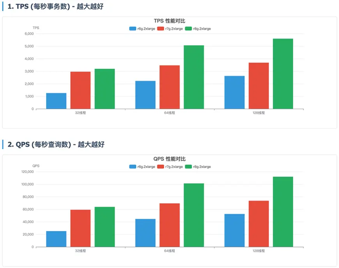 r7g.2xlarge TPS 提升 40%: 平衡的性能表现,适合大多数工作负载,在 128 线程下,测试结果为 15.55 百万 TPS/$;