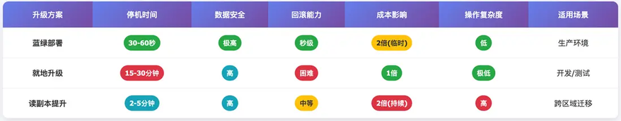 借助于 Q CLI 我们可以对三种典型的升级方案进行多维度的对比,对比维度包括停机时间/数据安全/回滚能力,以及适用的应用场景等: