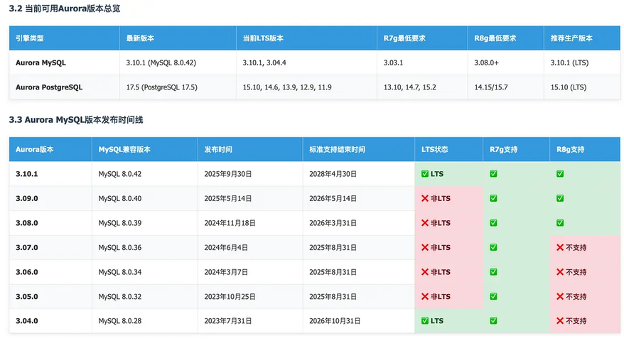 对于 Aurora MySQL 引擎推荐使用 3.10.0 (LTS),获得近 3 年的支持周期。更长的周期意味着更少的运维工作,同时也能避免强制升级带来的业务影响。