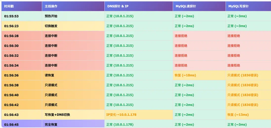 从上面的表格,在整个切换过程中读写探针和 DNS 探针所有的性能变化,报错类型,这些都尽收眼底,我们终于比较透彻了解切换过程应用程序的行为表现。