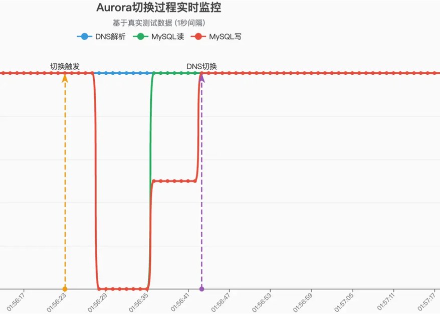 在 DNS 切换完成后写操作完全恢复正常,这表明 DNS 切换是应用恢复的唯一标记;