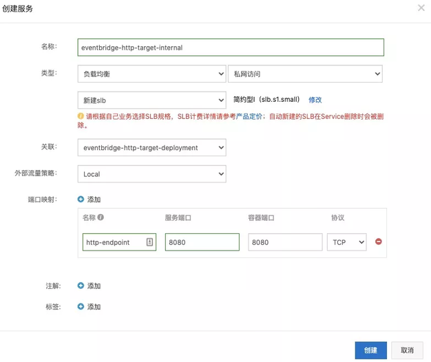 前往容器服务控制台,进入服务与路由的服务页面,创建一个私网访问类型的 Service,并做好端口映射。