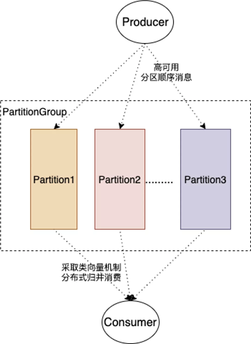 根据该算法,消费者在消费某一逻辑分区时,会从其所属的各个物理分区中拉取消息并进行合并排序,得出正确的消息顺序流。