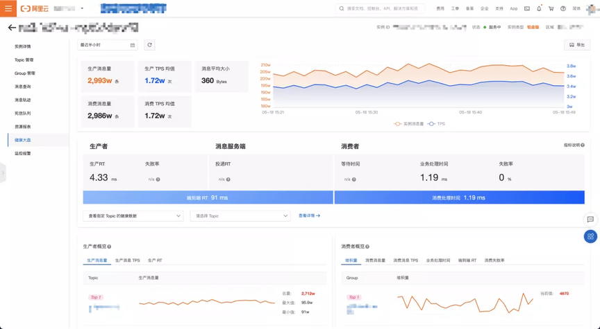 我们在可观测性方面也做了大量的工作,为用户提供了一个消息系统的可观测性健康数据大盘。如下图所示,用户能够清晰的看到实例级别、topic 级别、group 级别的各种监控数据,能够全方面地监控、诊断问题。