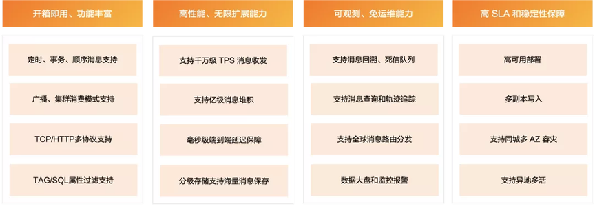 消息队列 RocketMQ 经受了阿里核心电商历年双十一洪峰的考验,支持千万级 TPS 消息收发和亿级消息堆积的能力,并且能够为消息提供毫秒级端到端延迟保障,另外还提供分级存储,支持海量消息的任意保存时间。