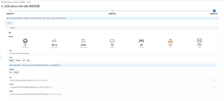 我们为总线 demo-with-k8s 创建一个规则,并选择 HTTP 作为事件目标,选择专有网络类型,选中对应的 VPC、 VSwitch 以及安全组,并指定目标 URL,如下图所示:
