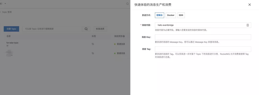 接下来我们回到消息队列 RocketMQ 控制台,通过控制台的快速体验消息生产功能发送一条内容为 hello eventbridge 的消息到对应的主题中去。