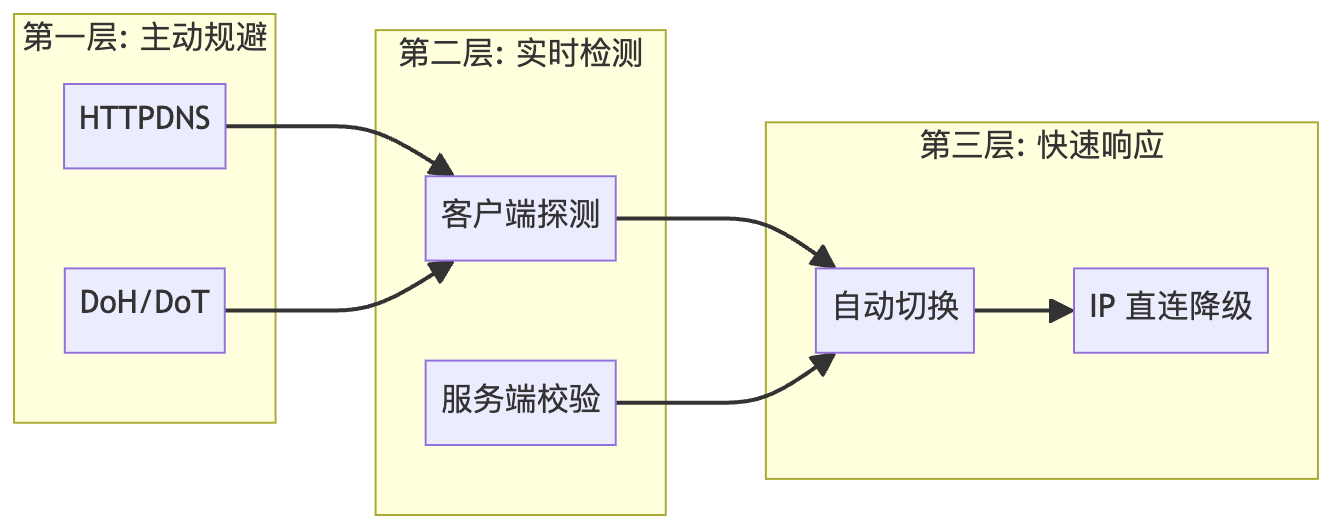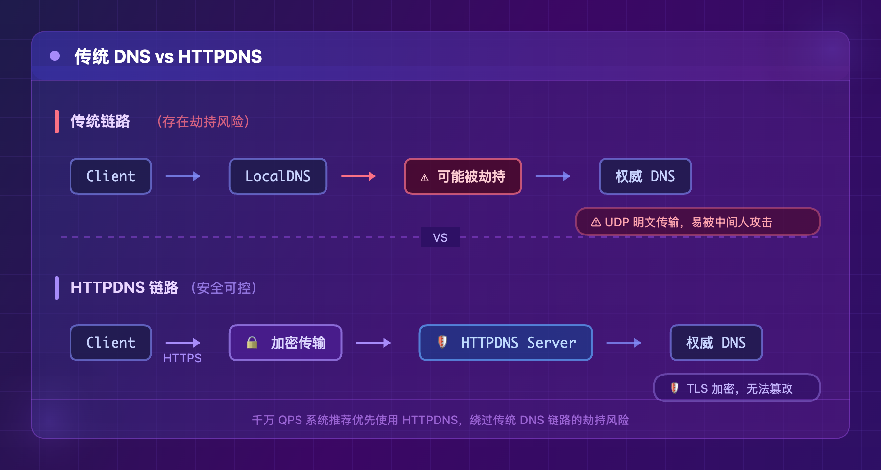 百万 QPS 系统可以将 DNS 劫持视为"偶发问题",通过被动监测和人工处理来应对。但千万 QPS 系统必须将其视为"必然发生的风险",需要: