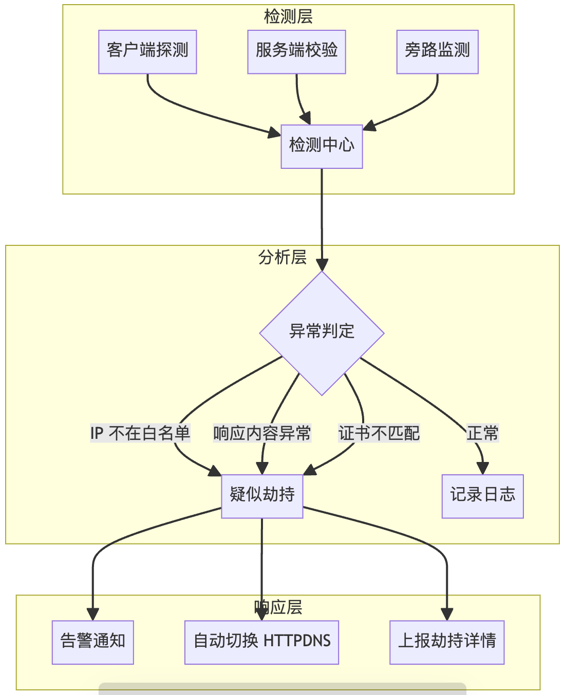 即使部署了 HTTPDNS,也不能完全放弃对传统 DNS 链路的监测——部分场景可能仍依赖传统 DNS,降级时也需要知道当前环境是否安全。