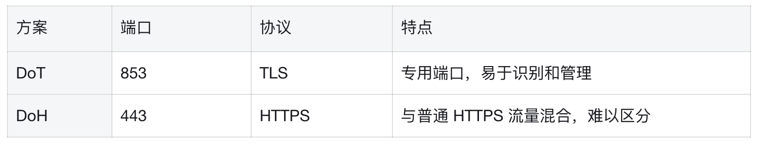 DoH(DNS over HTTPS)和 DoT(DNS over TLS)是 IETF 标准化的加密 DNS 方案: