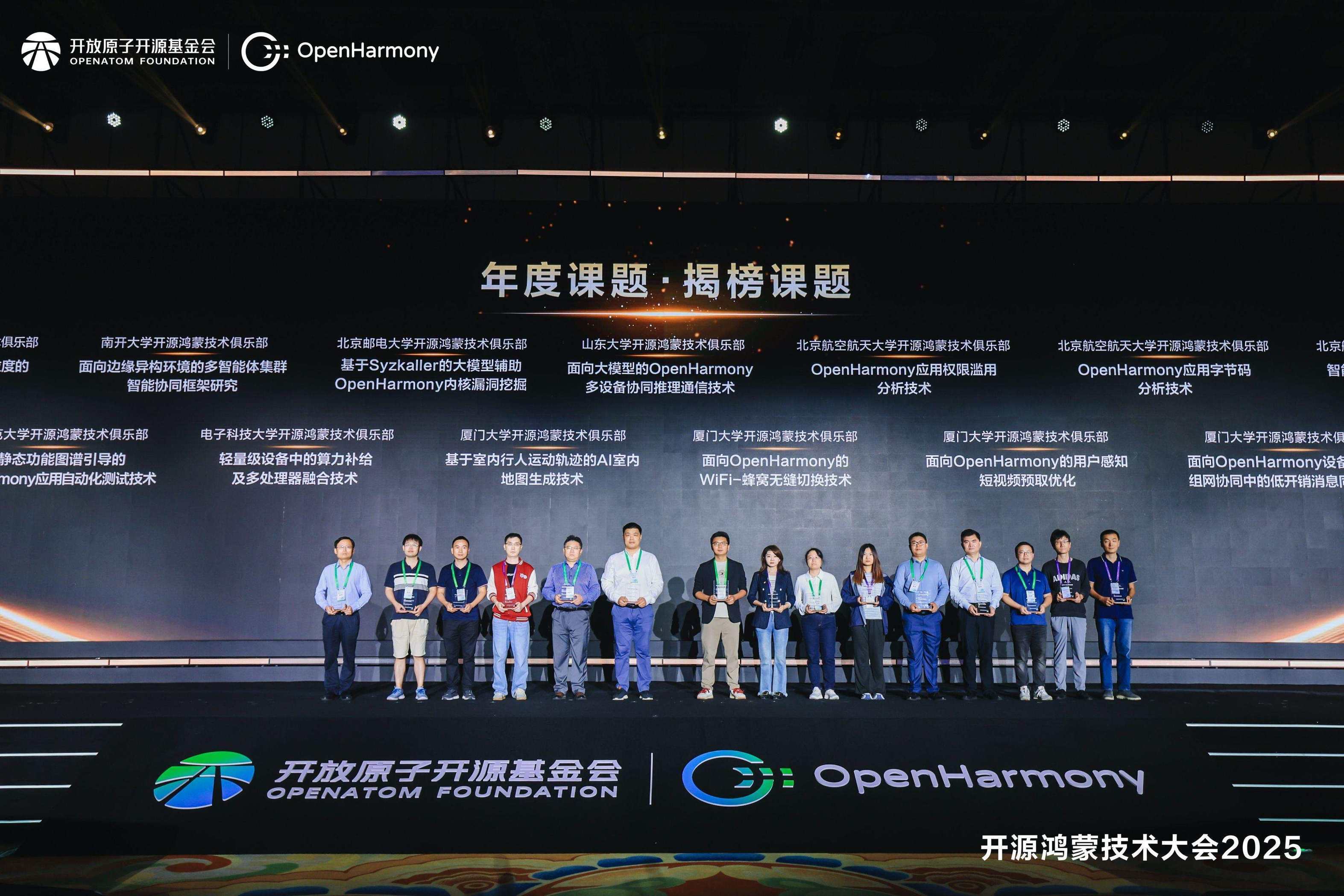 各高校技术俱乐部代表在大会现场揭榜 2025 年度开源鸿蒙技术课题
