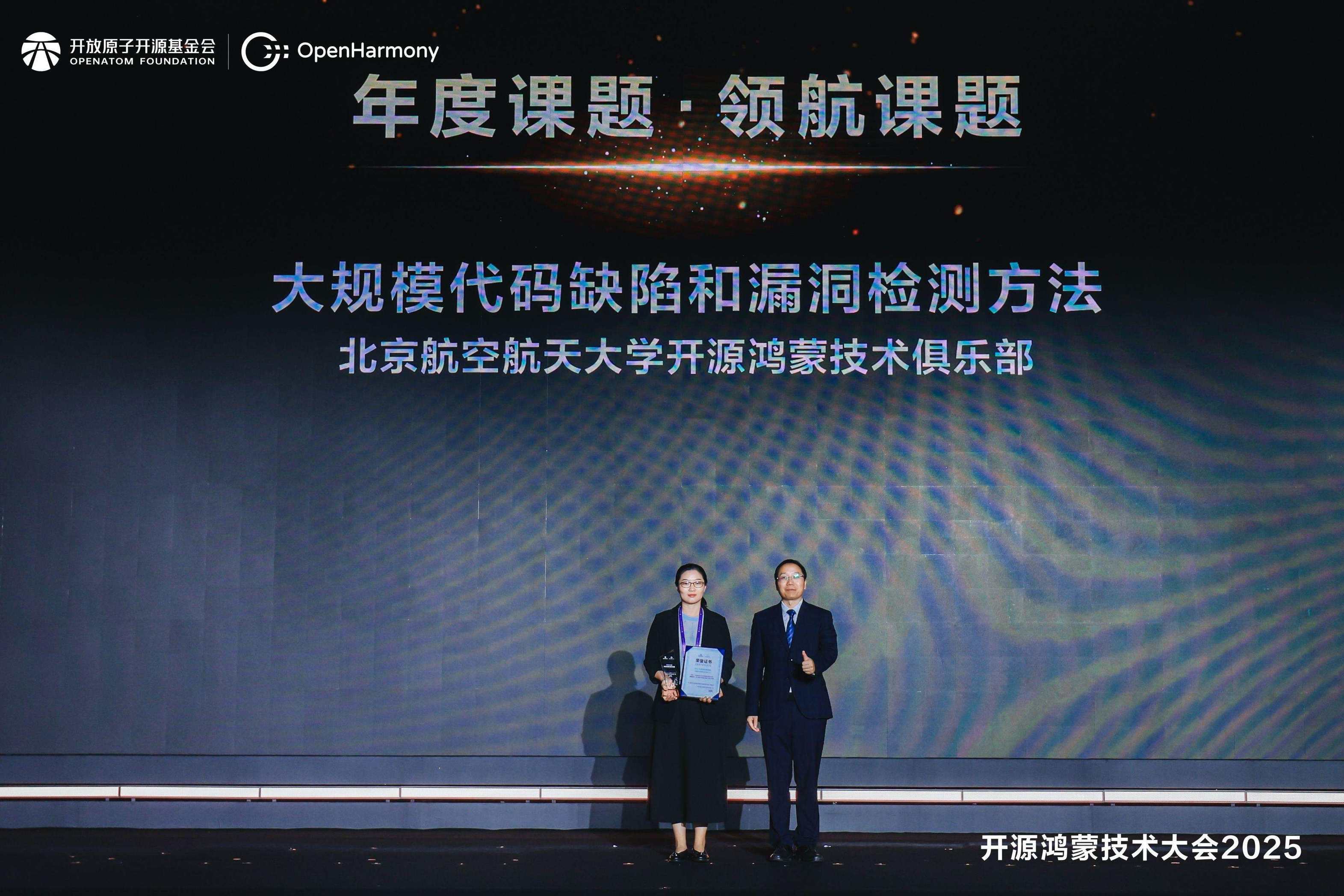 今年大会隆重揭晓了 2025 年度优秀课题评选结果。来自北京航空航天大学开源鸿蒙技术俱乐部的高祥团队凭借《大规模代码缺陷和漏洞检测方法》荣获年度“领航课题”。该课题深化了大规模代码静态分析能力,通过嵌入式 DSL 与多执行引擎架构的设计,实现对 C、Python 和 ArkTS 等多语言的高效检测,能够在开发早期发现并修复潜在漏洞。相关模块已在社区落地应用,发现并修复了多项安全问题,相关学术成果获得 IEEE TCSE 杰出论文奖。这一成果不仅提升了软件开发效率和质量,也为行业大规模代码安全检测提供了可推广的解决方案。