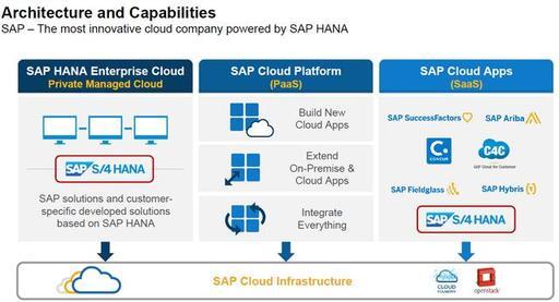 而最左侧的 SAP HANA Enterprise Cloud,是 SAP 一个私有云平台。这个平台上能购买的方案最主要的就是 SAP S/4HANA(当然也有 Business Suite 等)。客户购买产品后,SAP 负责搭建底层基础设施(Infrastructure)和系统运维。也就是说,这些系统实际上运行于 SAP 遍布全球的数据中心之一上。