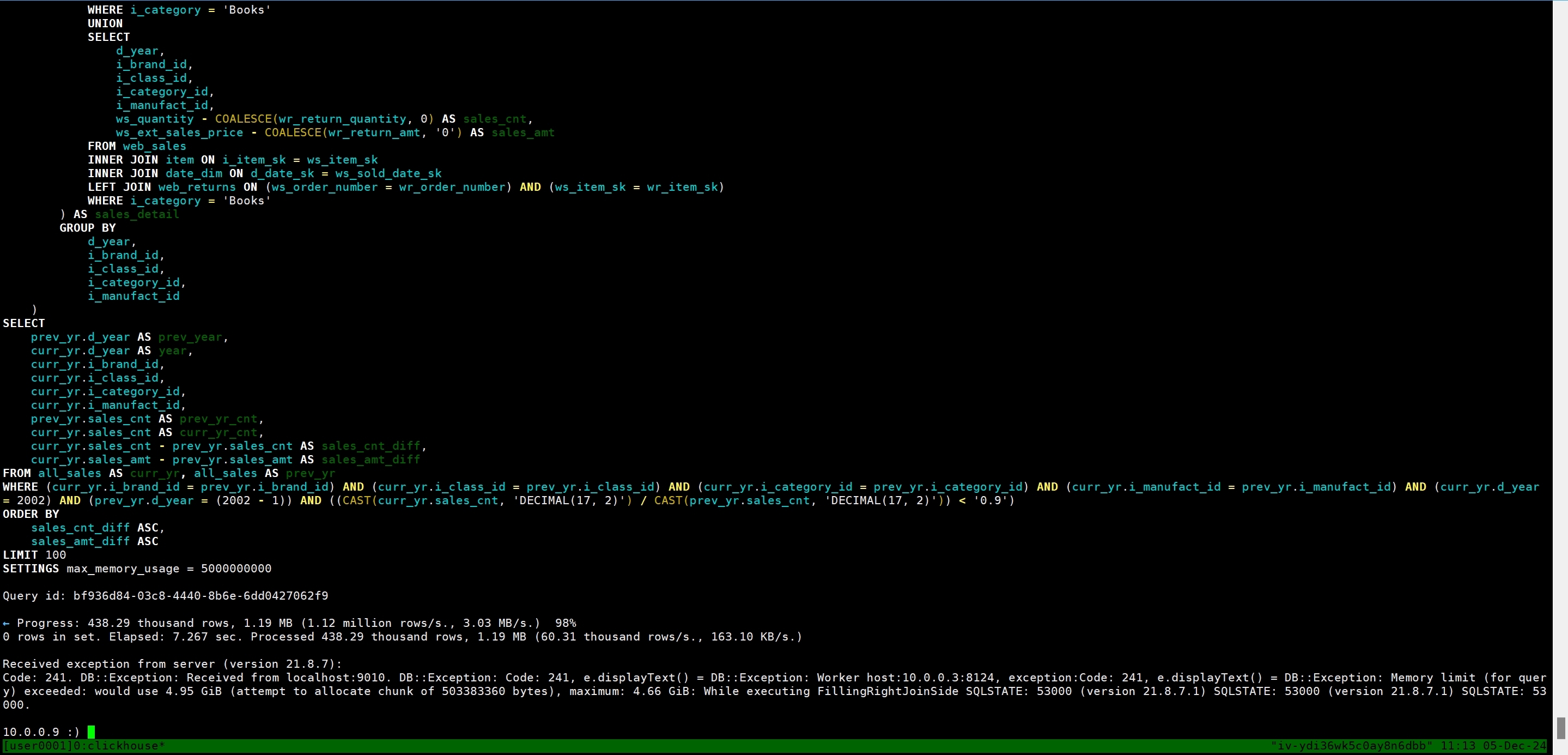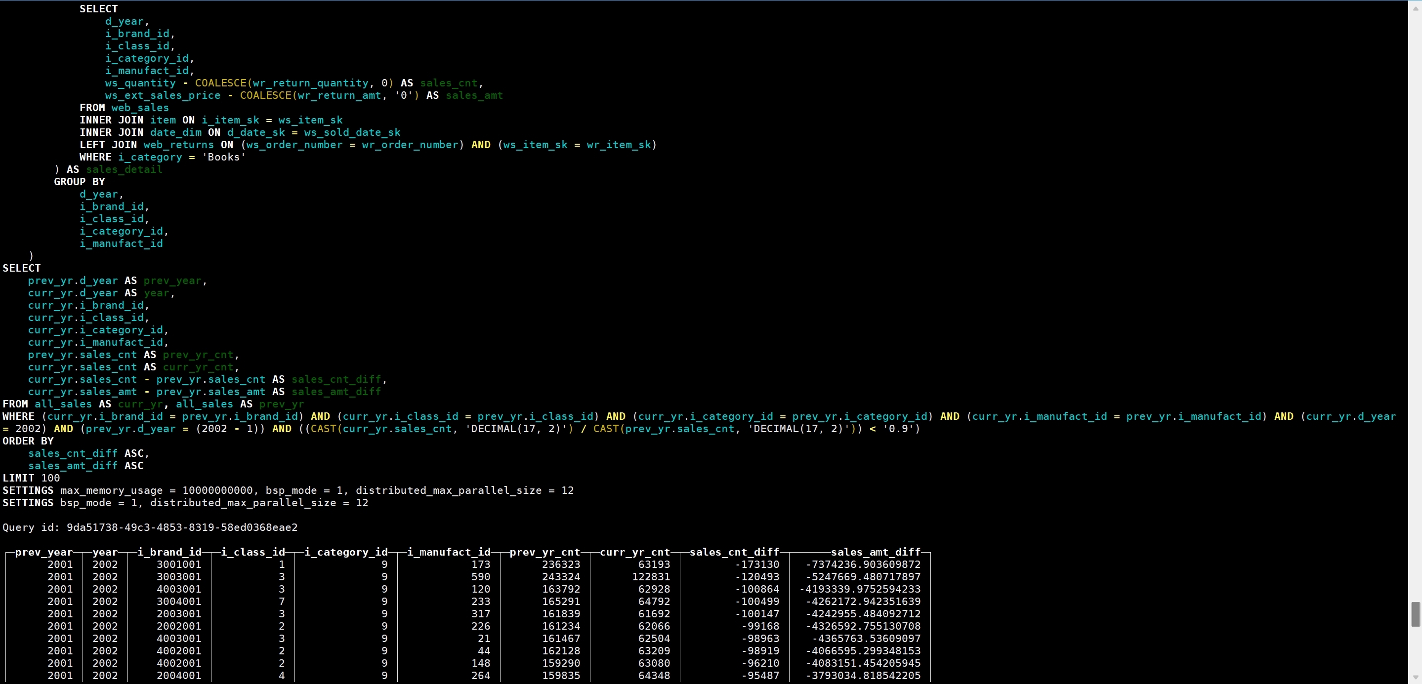 WITH all_sales AS ( SELECT d_year ,i_brand_id ,i_class_id ,i_category_id ,i_manufact_id ,SUM(sales_cnt) AS sales_cnt ,SUM(sales_amt) AS sales_amt FROM (SELECT d_year ,i_brand_id ,i_class_id ,i_category_id ,i_manufact_id ,cs_quantity - COALESCE(cr_return_quantity,0) AS sales_cnt ,cs_ext_sales_price - COALESCE(cr_return_amount,0.0) AS sales_amt FROM catalog_sales JOIN item ON i_item_sk=cs_item_sk JOIN date_dim ON d_date_sk=cs_sold_date_sk LEFT JOIN catalog_returns ON (cs_order_number=cr_order_number AND cs_item_sk=cr_item_sk) WHERE i_category='Books' UNION SELECT d_year ,i_brand_id ,i_class_id ,i_category_id ,i_manufact_id ,ss_quantity - COALESCE(sr_return_quantity,0) AS sales_cnt ,ss_ext_sales_price - COALESCE(sr_return_amt,0.0) AS sales_amt FROM store_sales JOIN item ON i_item_sk=ss_item_sk JOIN date_dim ON d_date_sk=ss_sold_date_sk LEFT JOIN store_returns ON (ss_ticket_number=sr_ticket_number AND ss_item_sk=sr_item_sk) WHERE i_category='Books' UNION SELECT d_year ,i_brand_id ,i_class_id ,i_category_id ,i_manufact_id ,ws_quantity - COALESCE(wr_return_quantity,0) AS sales_cnt ,ws_ext_sales_price - COALESCE(wr_return_amt,0.0) AS sales_amt FROM web_sales JOIN item ON i_item_sk=ws_item_sk JOIN date_dim ON d_date_sk=ws_sold_date_sk LEFT JOIN web_returns ON (ws_order_number=wr_order_number AND ws_item_sk=wr_item_sk) WHERE i_category='Books') sales_detail GROUP BY d_year, i_brand_id, i_class_id, i_category_id, i_manufact_id) SELECT prev_yr.d_year AS prev_year ,curr_yr.d_year AS year ,curr_yr.i_brand_id ,curr_yr.i_class_id ,curr_yr.i_category_id ,curr_yr.i_manufact_id ,prev_yr.sales_cnt AS prev_yr_cnt ,curr_yr.sales_cnt AS curr_yr_cnt ,curr_yr.sales_cnt-prev_yr.sales_cnt AS sales_cnt_diff ,curr_yr.sales_amt-prev_yr.sales_amt AS sales_amt_diff FROM all_sales curr_yr, all_sales prev_yr WHERE curr_yr.i_brand_id=prev_yr.i_brand_id AND curr_yr.i_class_id=prev_yr.i_class_id AND curr_yr.i_category_id=prev_yr.i_category_id AND curr_yr.i_manufact_id=prev_yr.i_manufact_id AND curr_yr.d_year=2002 AND prev_yr.d_year=2002-1 AND CAST(curr_yr.sales_cnt AS DECIMAL(17,2))/CAST(prev_yr.sales_cnt AS DECIMAL(17,2))<0.9 ORDER BY sales_cnt_diff,sales_amt_diff limit 100 SETTINGS max_memory_usage=5000000000;