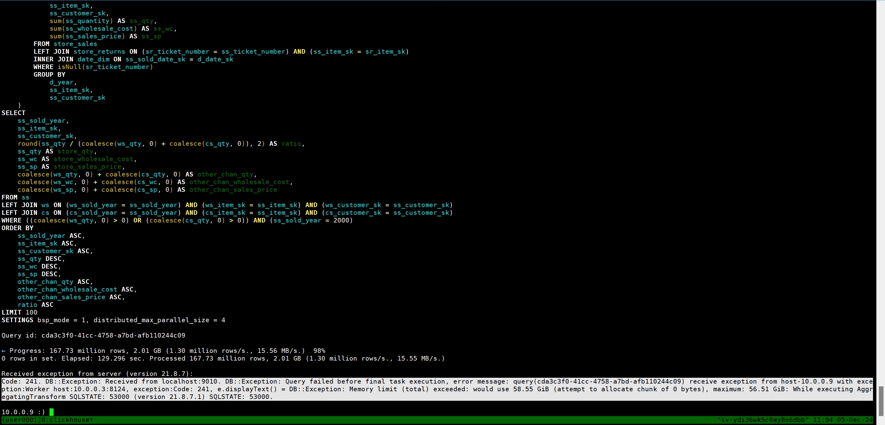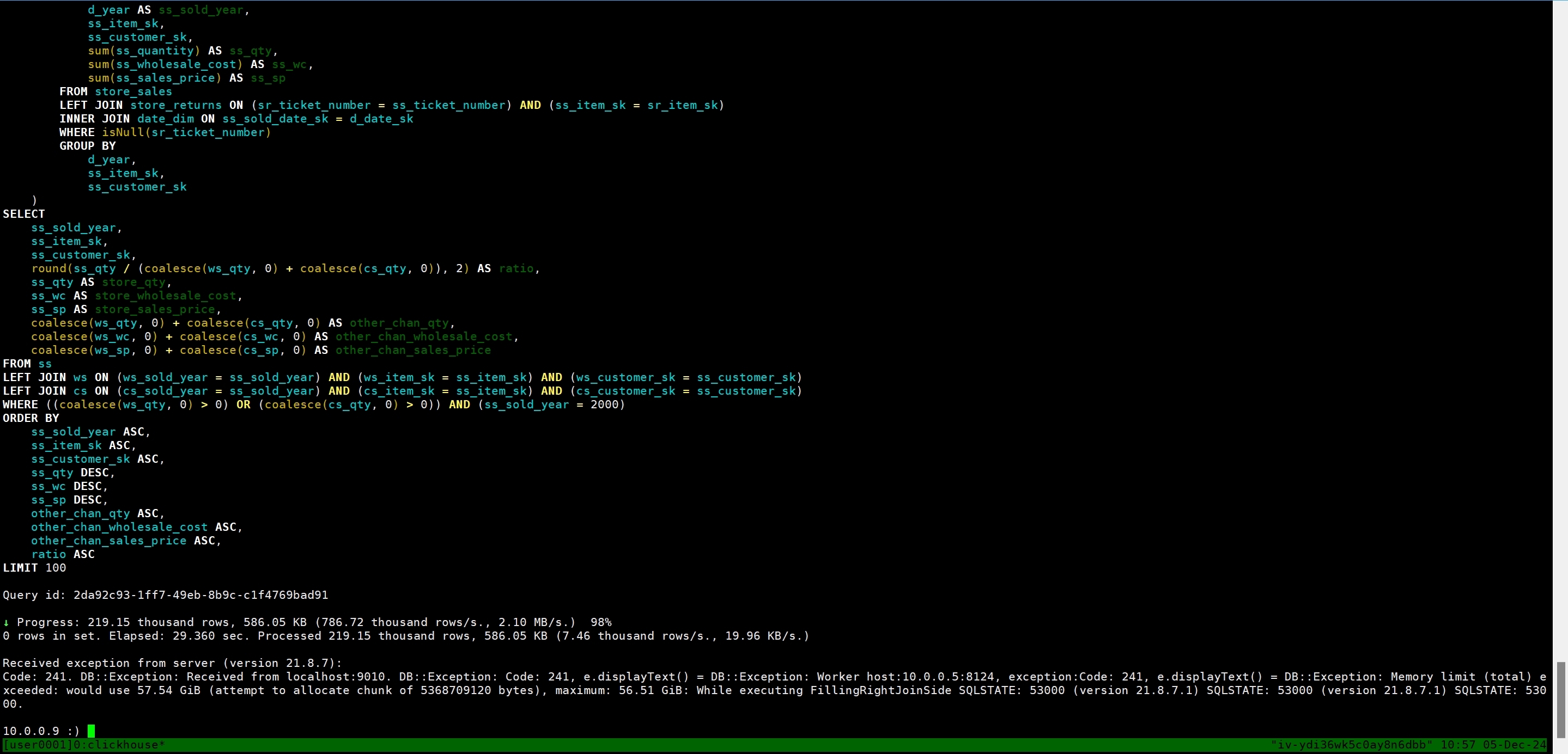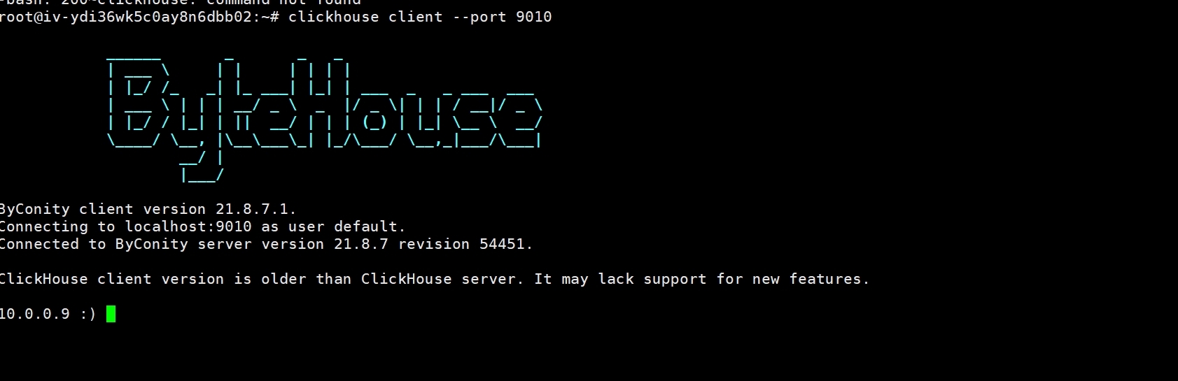tmux new -s user0001 clickhouse client --port 9010命令创建一个新的 tmux 会话,并进入客户端。
