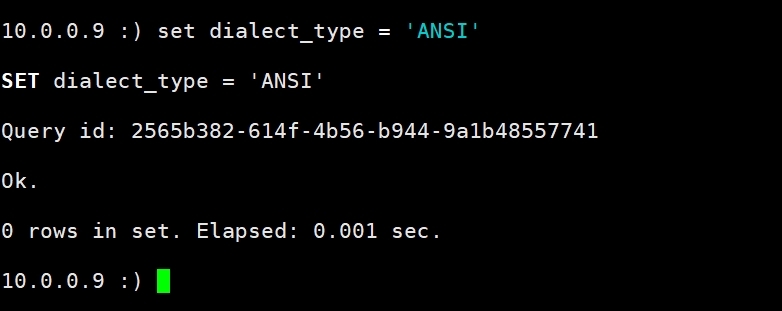 use test_elt由于 TPC-DS 定义的查询语法为标准 SQL,设置数据库会话的方言类型为 ANSI: