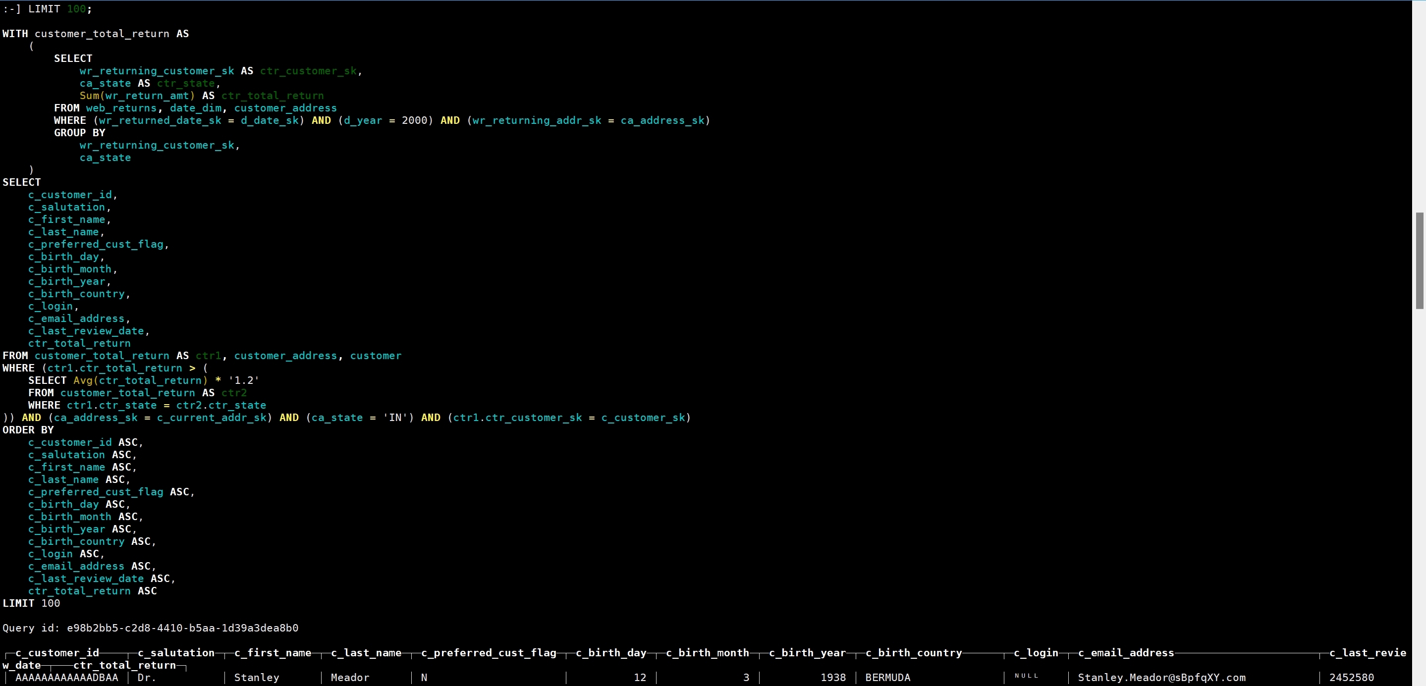 WITH customer_total_return AS (SELECT wr_returning_customer_sk AS ctr_customer_sk, ca_state AS ctr_state, Sum(wr_return_amt) AS ctr_total_return FROM web_returns, date_dim, customer_address WHERE wr_returned_date_sk = d_date_sk AND d_year = 2000 AND wr_returning_addr_sk = ca_address_sk GROUP BY wr_returning_customer_sk, ca_state) SELECT c_customer_id, c_salutation, c_first_name, c_last_name, c_preferred_cust_flag, c_birth_day, c_birth_month, c_birth_year, c_birth_country, c_login, c_email_address, c_last_review_date, ctr_total_return FROM customer_total_return ctr1, customer_address, customer WHERE ctr1.ctr_total_return > (SELECT Avg(ctr_total_return) * 1.2 FROM customer_total_return ctr2 WHERE ctr1.ctr_state = ctr2.ctr_state) AND ca_address_sk = c_current_addr_sk AND ca_state = 'IN' AND ctr1.ctr_customer_sk = c_customer_sk ORDER BY c_customer_id, c_salutation, c_first_name, c_last_name, c_preferred_cust_flag, c_birth_day, c_birth_month, c_birth_year, c_birth_country, c_login, c_email_address, c_last_review_date, ctr_total_returnLIMIT 100; 可见执行成功,速度非常快。