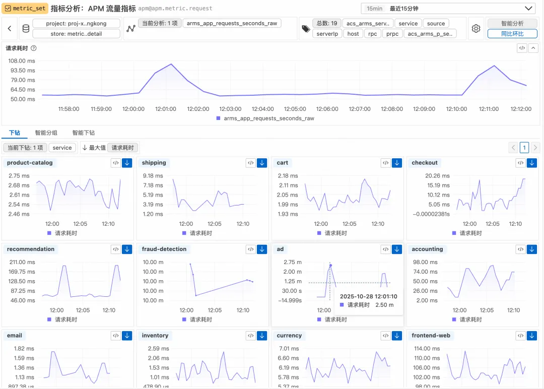 举个例子,假设我们发现请求延迟指标出现了尖峰。首先在概览页点击该指标进入详情,此时看到的是全局聚合后的曲线。接下来选择一个维度进行下钻,比如按“服务”分组。系统会立即展示每个服务的延迟曲线,很可能我们会发现某一个服务的延迟特别高。