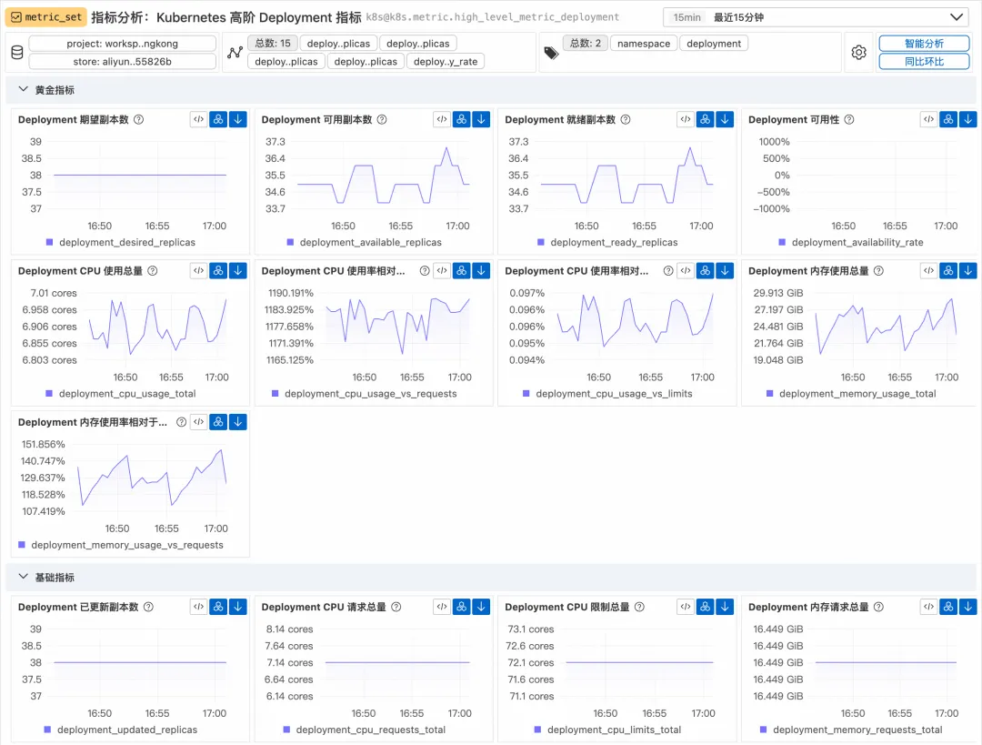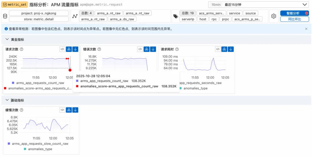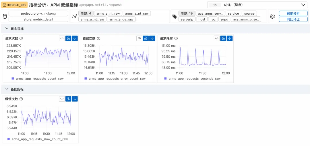 在普通视图下,指标按照黄金指标和基础指标分类展示。黄金指标通常是对系统健康度最有代表性的几个核心指标,比如请求延迟、错误率、吞吐量等。这种分类方式源于 SRE 实践中的最佳实践,能够帮助用户快速抓住系统的关键状态。