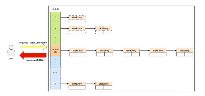 更糟糕的是,如果某个哈希桶中恰好存储了大量的 key-value 对,那么搬迁这个桶就需要花费更长的时间。如图八所示,图中的 rehash 正进行到了一个元素数量很多的桶,此时恰好有一个用户向 Redis 发送了读请求,该请求必须等待 rehashidx 指向的桶中所有元素完成迁移后才能继续执行,从而导致响应延迟显著增加。