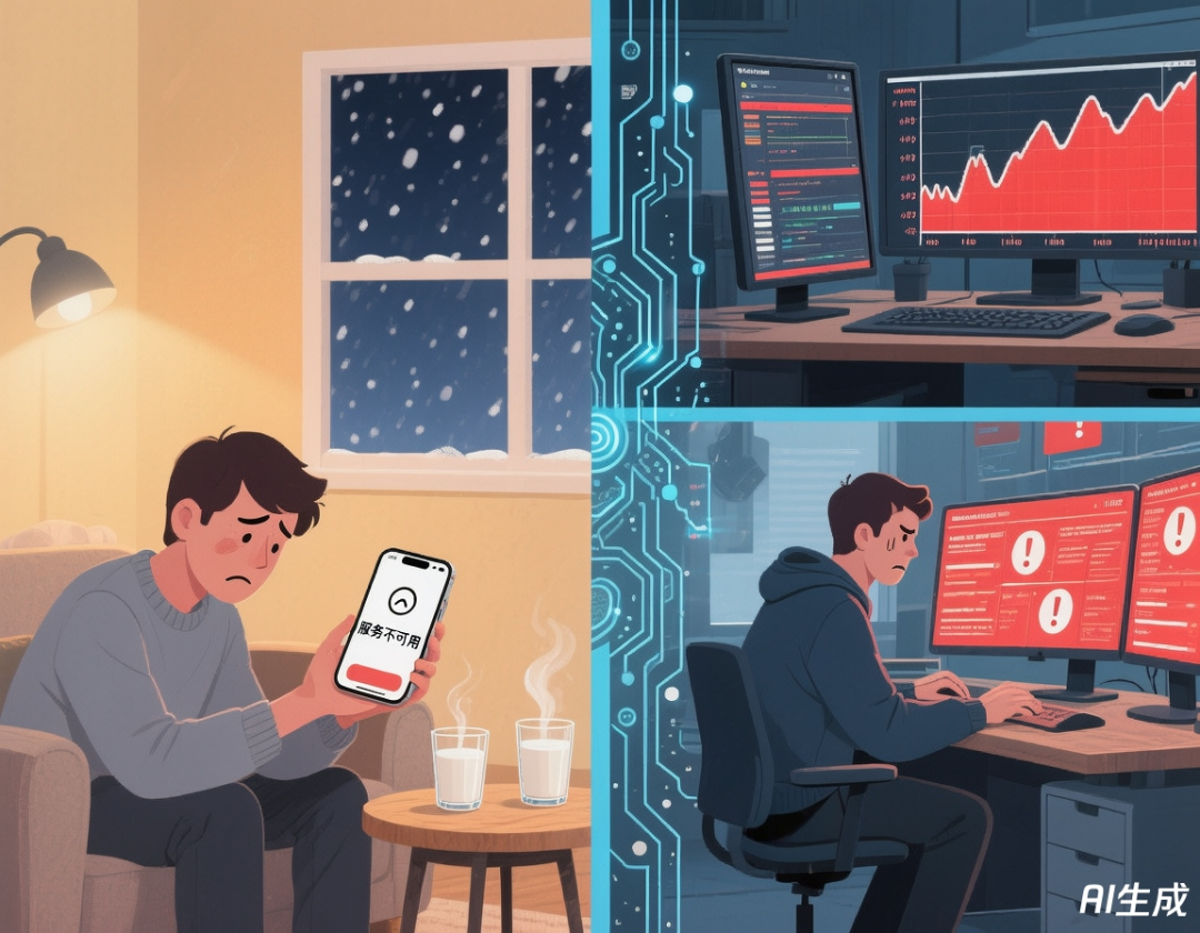 这是一个寒冷的冬夜,你拖着疲惫的身躯回到家中,盛满一杯热牛奶,躺在松软的沙发上。“终于到周末啦!”,你一边庆祝着,一边郑重地打开了你最爱的娱乐软件,准备狠狠 happy 一波。但天有不测风云,平时能轻松登录的应用软件,今天竟然显示“登录失败”。你以为是网络问题,于是熟练地刷新页面、切换网络,但那个刺眼的提示依旧顽固地占据着屏幕,直到各种方法用尽,却依然无法登录后,你恍然大悟——应用服务崩了!