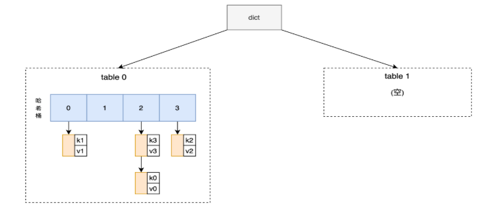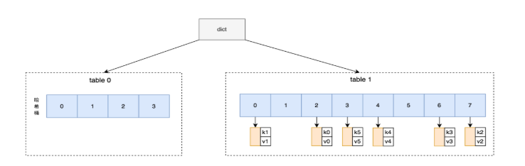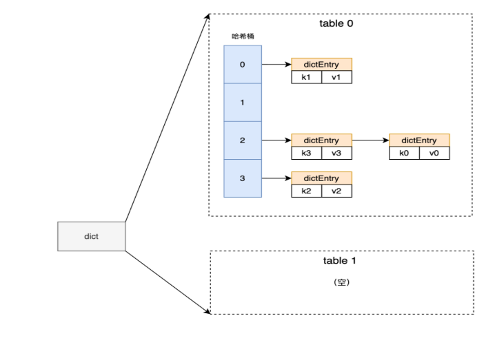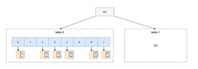 (4)rehash 完成后释放 table0,把释放后的 table0 和拥有完整数据的 table1 交换一下(可以理解为交换名字),扩容完成。扩容完成后的 dict 如图六所示。