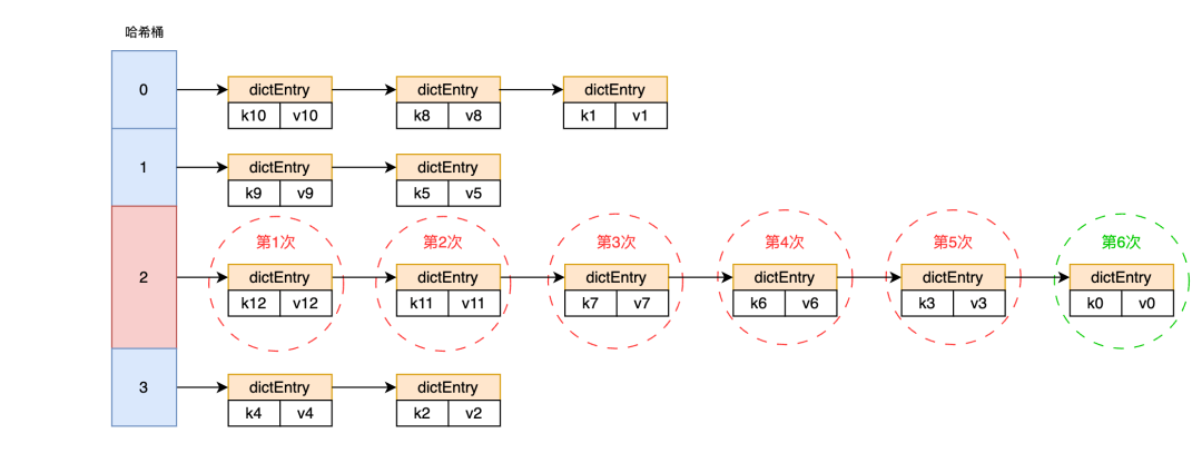 在写数据时,数据是直接写到链表头部的,因此写数据的时间复杂度可以稳定在 O(1),但读数据就没有这么幸运了。当一个哈希桶里有多对 key-value 时,Redis 会从链表头部开始遍历,依次比较每个链表节点的 key 与目标 key 是否一致:如果不一致,则比较下一个节点;如果一致,则返回该节点的 value。