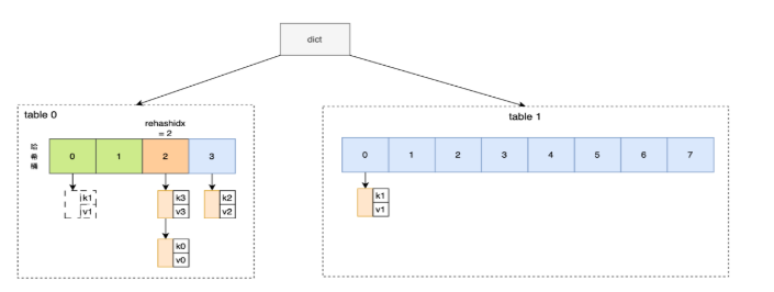 这里做一些补充说明:Redisrehash 的最小单位是一个哈希桶,一次 rehash 至少会把一个哈希桶里的所有元素全部搬到新表。Redis 的 dict 维护了一个索引计数器变量 rehashidx,用于记录渐进式 rehash 进行到了哪个位置,或者说 rehashidx 就是下一个要被迁移的桶的桶号。rehashidx 从 0 开始,每次搬完一个桶后就加 1。如图七所示,table0 中的 0 号桶最先被迁移;1 号桶是空桶,被跳过;目前 rehash 进行到了 2 号桶,在下一次迁移时,2 号桶中的两个元素都会被迁移。