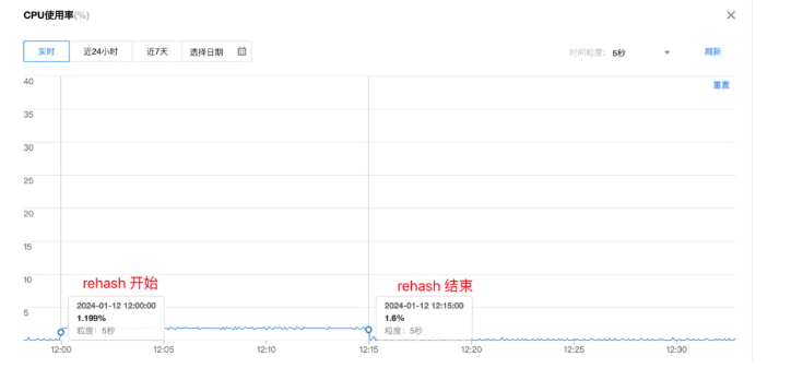 从实例监控图像中可以看到,触发 rehash 后,CPU 资源平均只会消耗 2% 左右。约 3300W 个 key 搬迁耗时是 15 分钟,平均 1 分钟可以 rehash 搬迁约 220W 个 key。