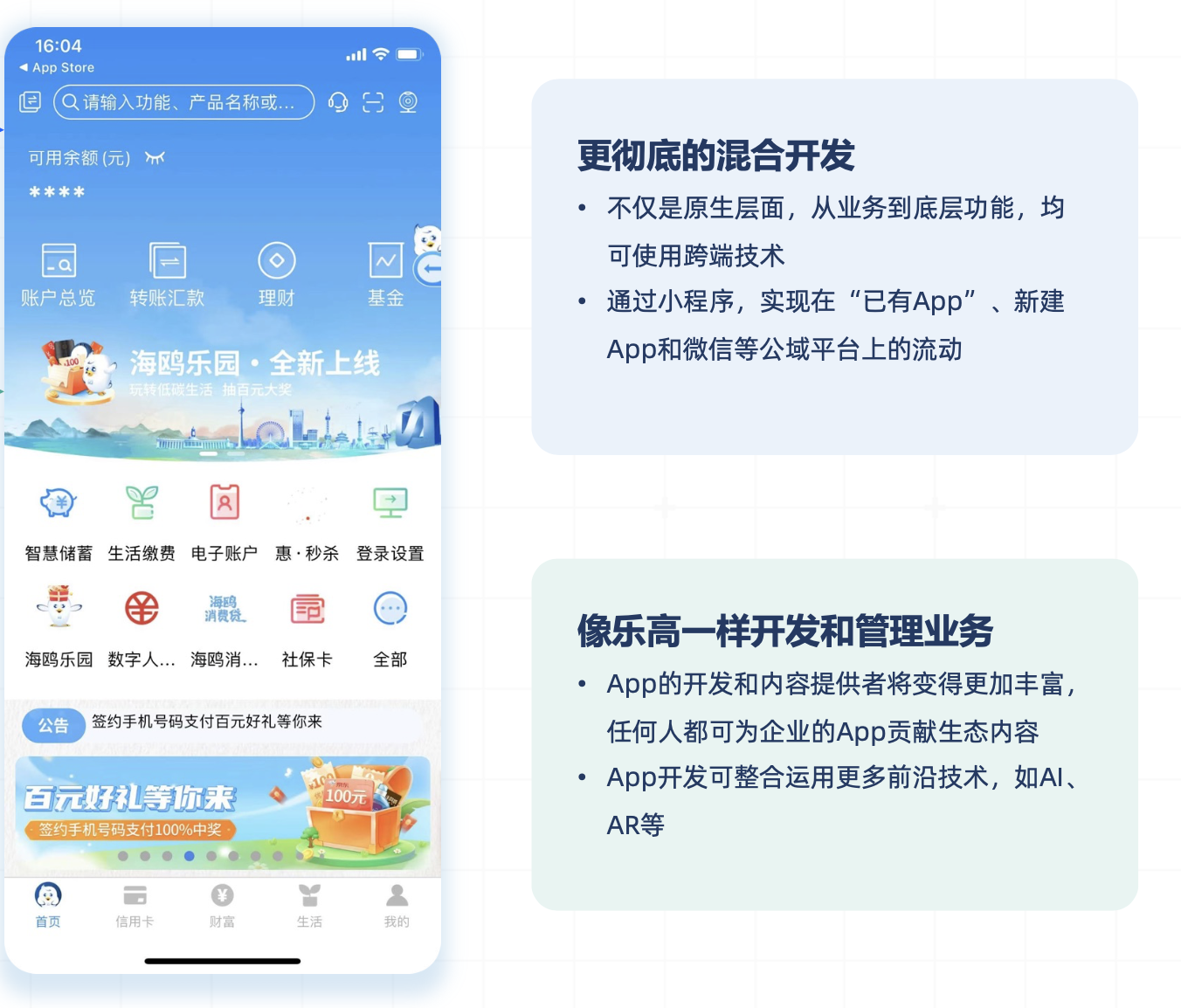 某大型银行引入FinClip后,不仅将信用卡营销活动迭代速度提升 5 倍,更通过开放平台接入 20 余家合作机构的小程序,打造出金融服务"超级入口"。这种转变就像把百货商场升级为购物中心——既自主运营核心商铺,又通过品牌联营丰富业态。