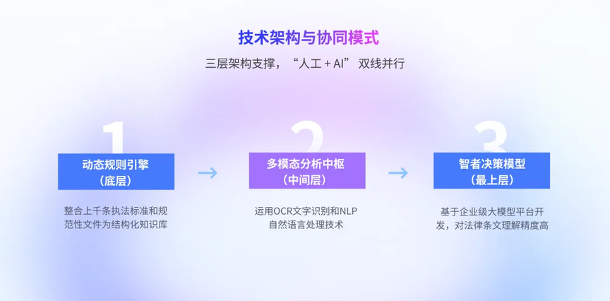 系统采用三层技术架构设计。底层为动态规则引擎,负责整合上千条分散的执法标准与规范性文件,构建成结构化的知识库。