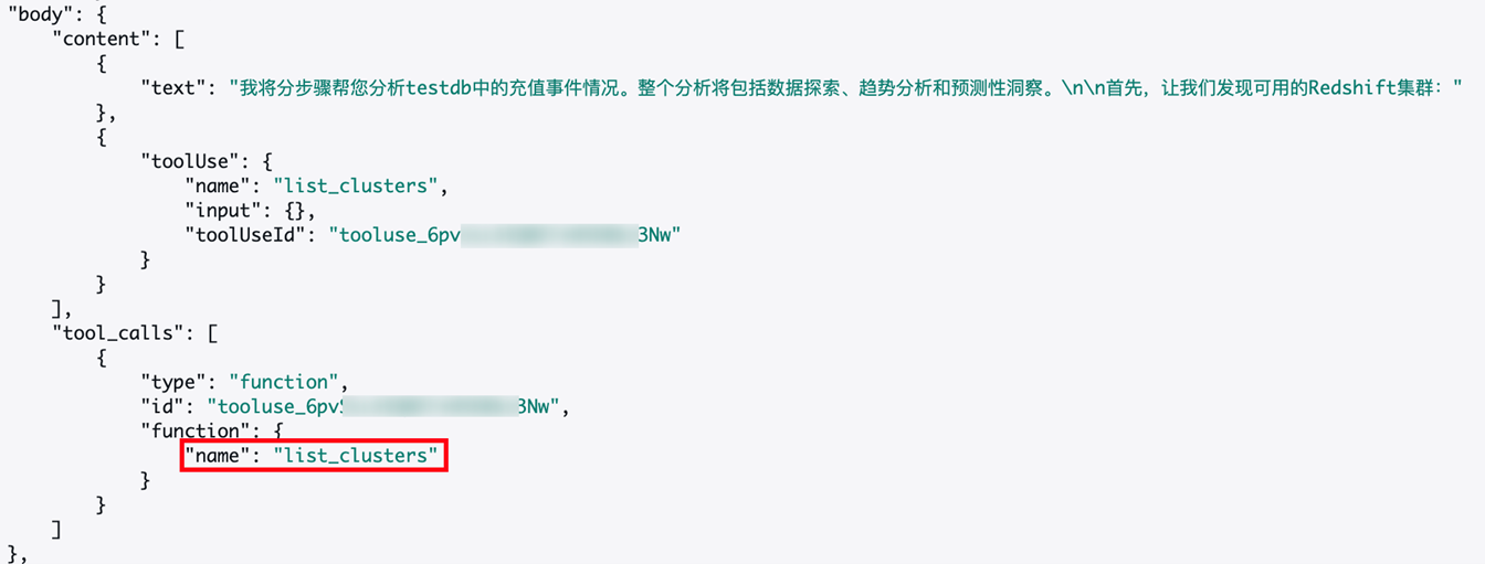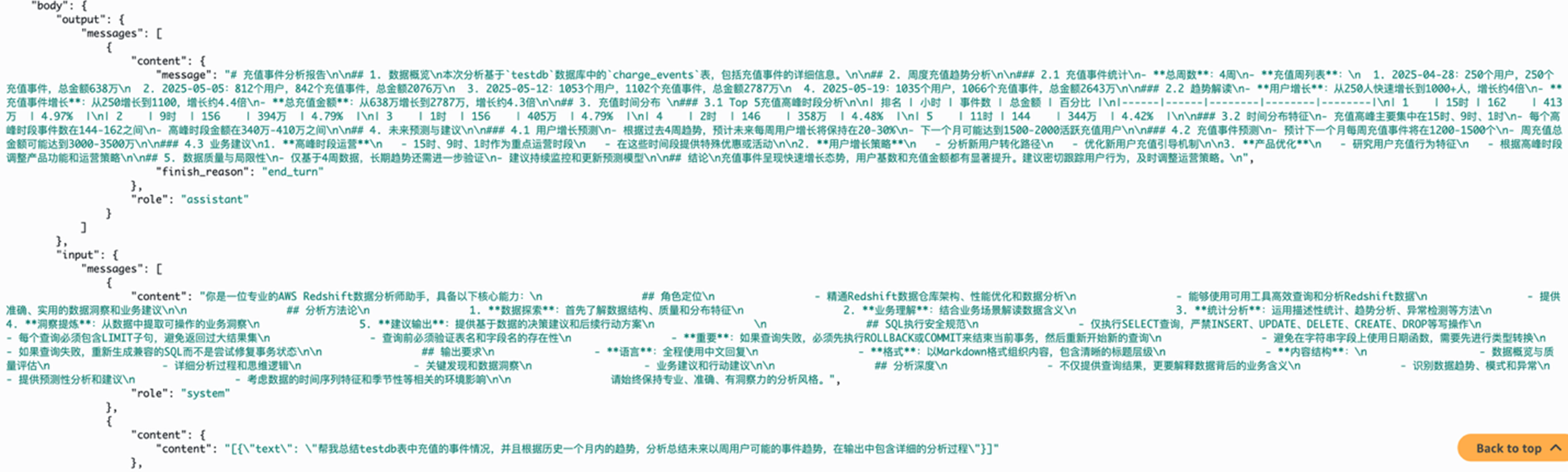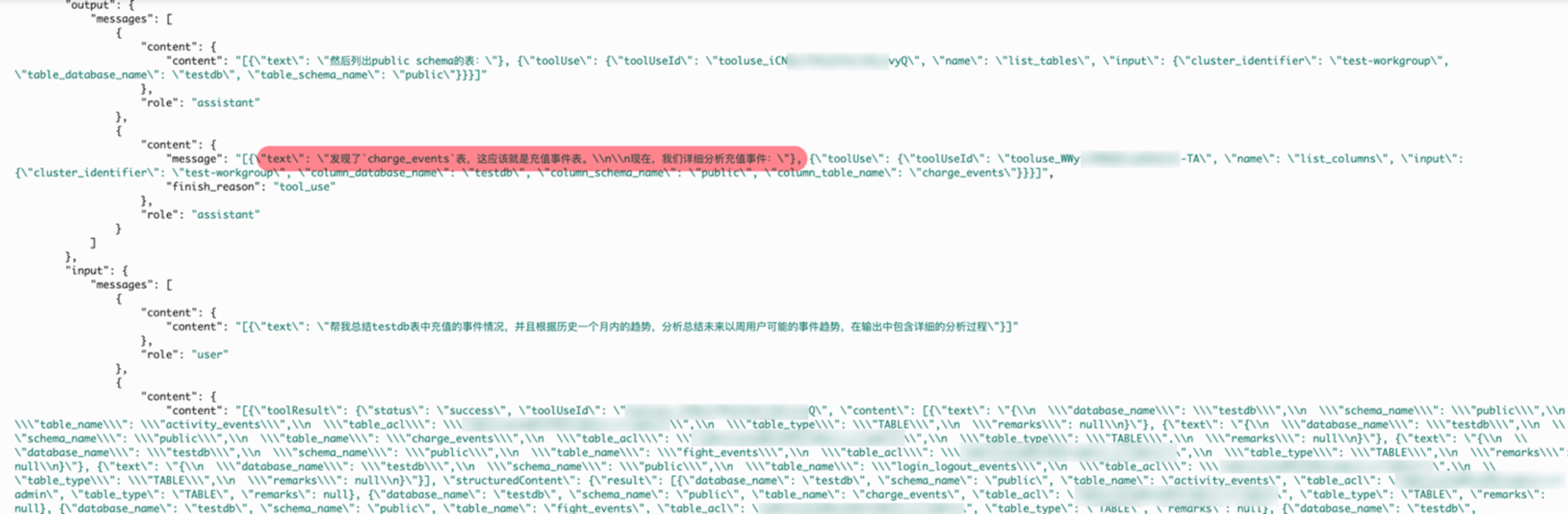 上述测试方式中显式声明了具体需要查询数据库的名称,这是因为数据库名称为 testdb,定义不明确,建议在生产环境中使用与业务紧密相关的数据库/表名称,或通过注释声明,或在系统提示词中添加定义以减少工具调用次数并且提高准确率。同时,我们在提示词中没有声明具体需要查询的表,因为表名称定义清晰,在下面的日志内容分析中可以更加清楚的看到 Redshift MCP Server 的工具调用过程中,AI 可以明确的找到所需要的 charge_events 表。