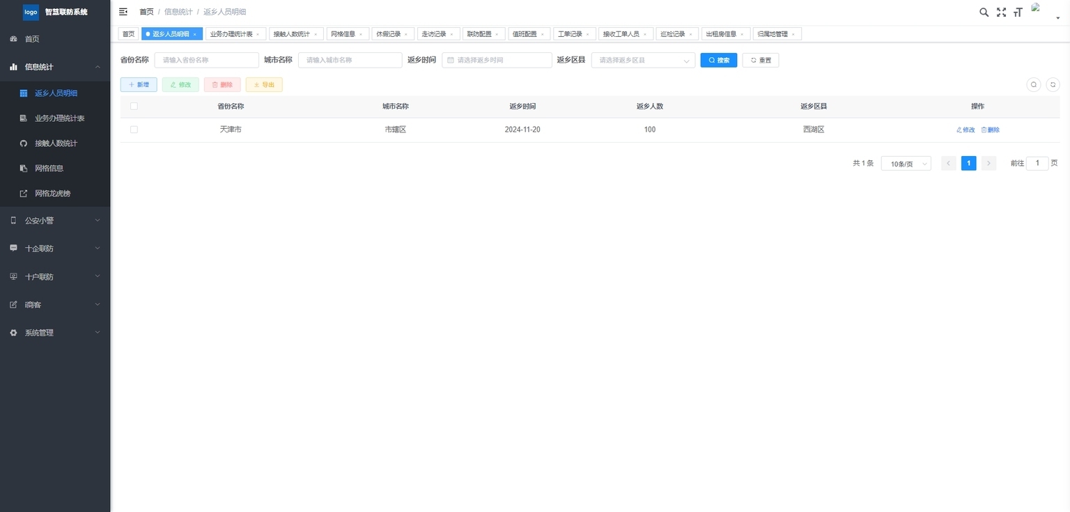 返乡人员明细:记录和管理返乡人员的详细信息,包括行程和健康状况,助力精准掌握返乡人员动态,为疫情防控、人员服务等工作提供数据支撑。