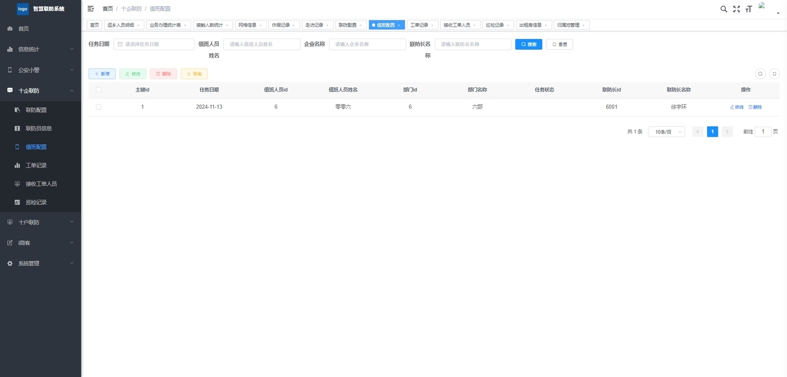 值班配置:安排和调整值班人员的值班时间和职责,规范值班管理,确保联防工作 24 小时不间断开展。
