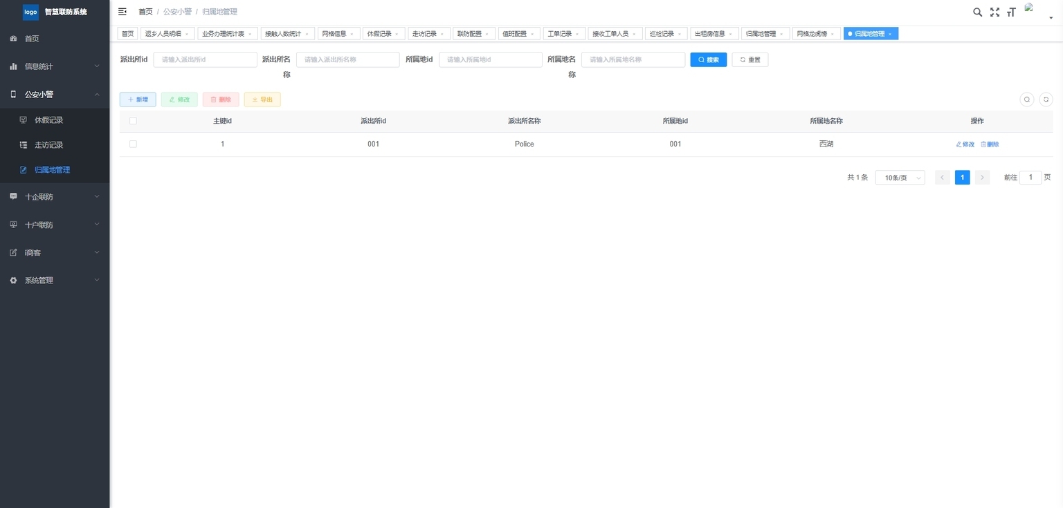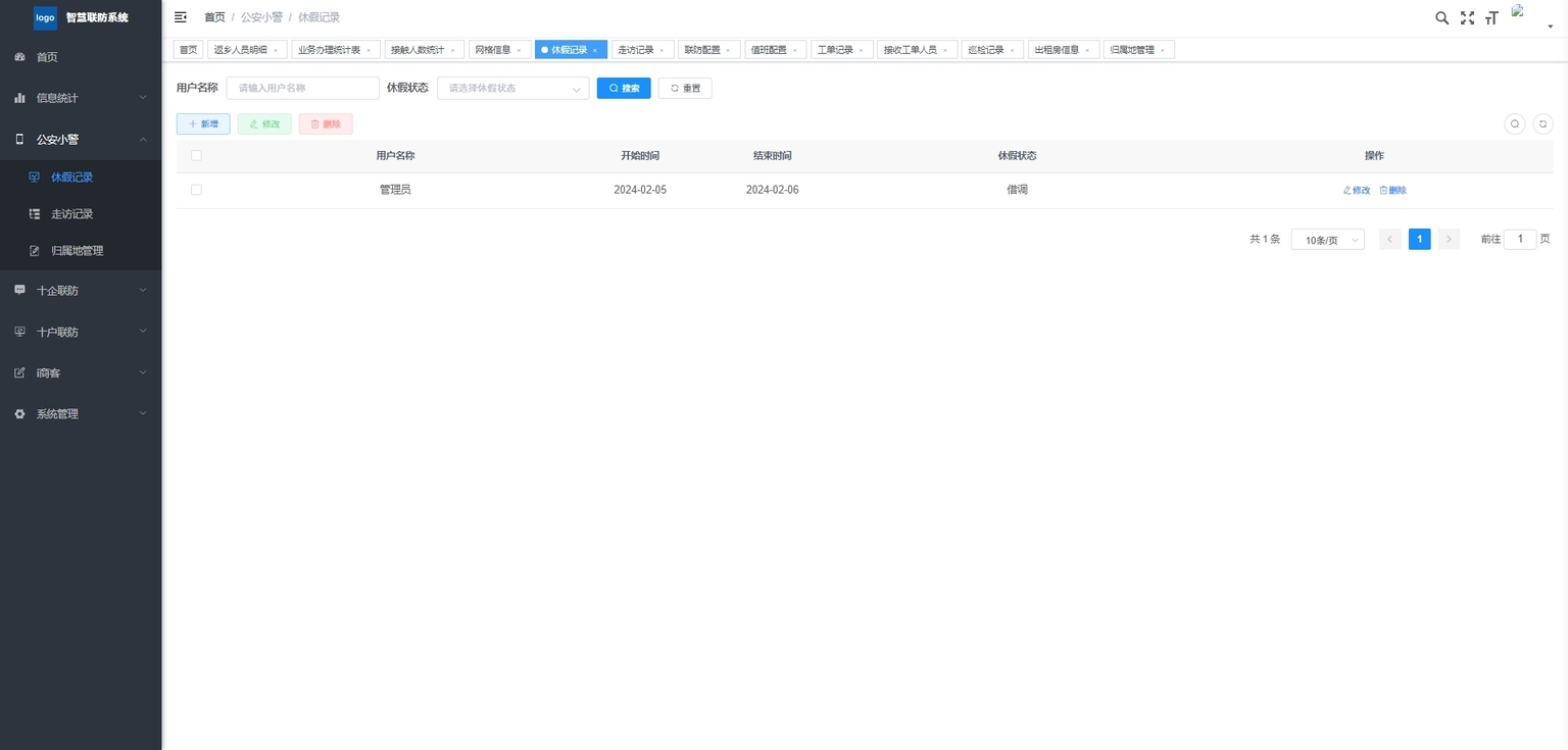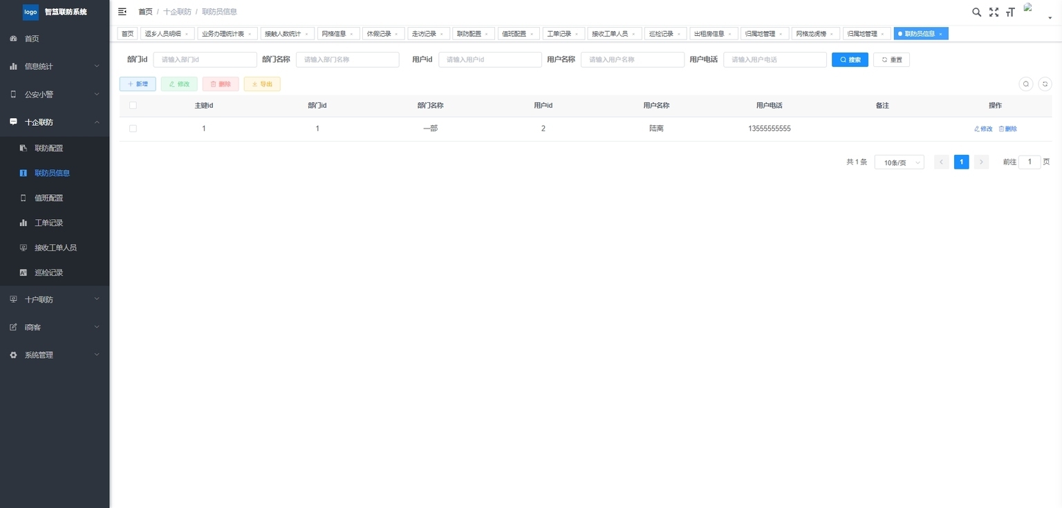 联防员信息:管理联防员的个人信息和工作记录,实现联防员信息的集中管理,便于跟踪工作表现、优化人员调度。