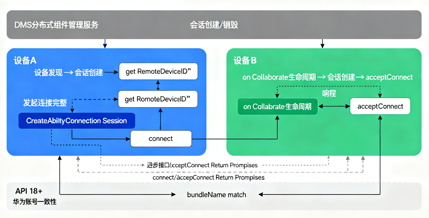 // 获取协同token,必须传入acceptConnect const collabToken = collabParam["ohos.dms.collabToken"] as string; try { await abilityConnectionManager.acceptConnect(sessionId, collabToken); hilog.info(0x0000, 'testTag', '接受连接成功'); AppStorage.setOrCreate('sessionId', sessionId); } catch (error) { hilog.error(0x0000, 'testTag', `接受连接失败: ${JSON.stringify(error)}`); } }