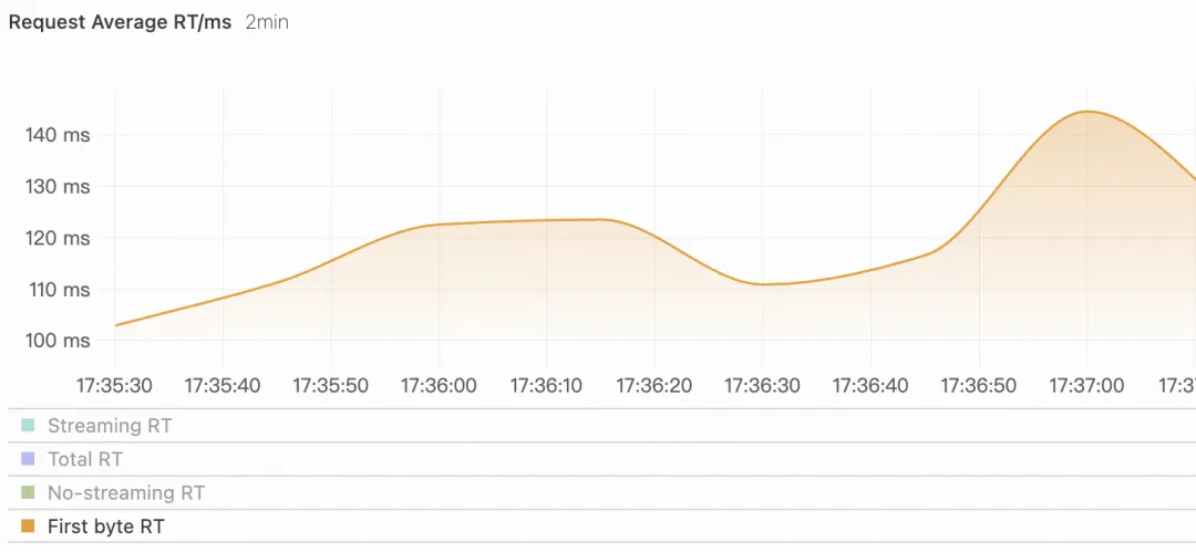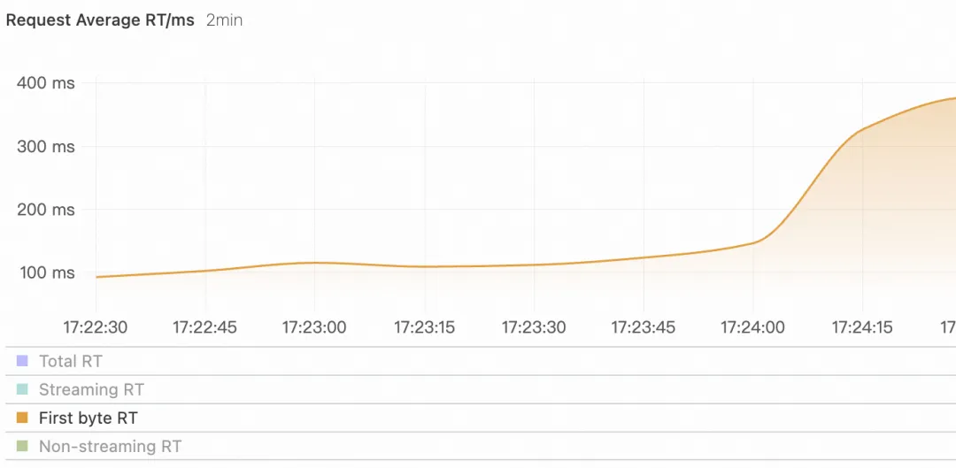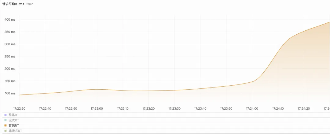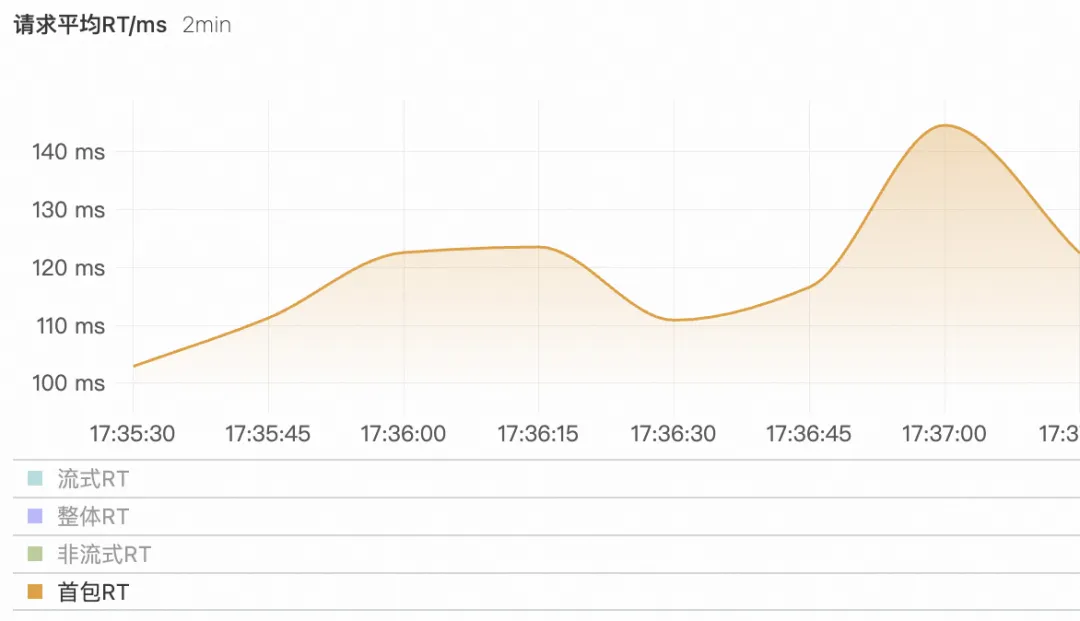 用户请求激增时,可以看到首包 RT 随者请求数而增加,说明 LLM 服务的负载压力也在逐渐增加。
