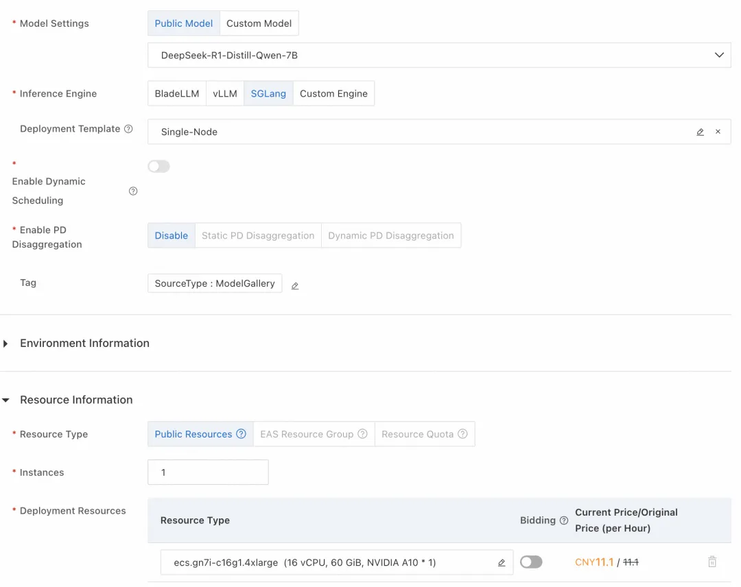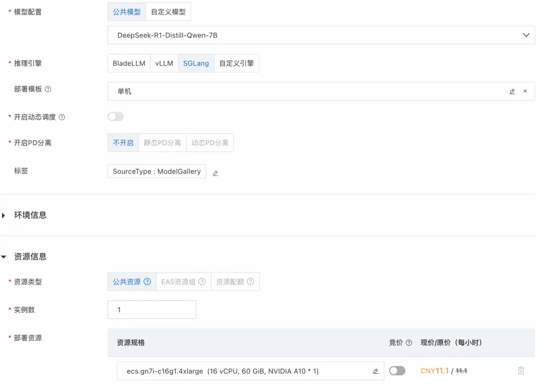 如下图所示,这里模型类别选择 DeepSeek-R1-Distill-Qwen-7B,资源类型选择 ml.gu7i.c8m30.1-gu30,具有 24G 显存。