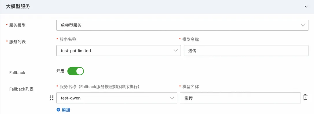 然后选择 LLM API 选项卡,点击创建 LLM API 按钮,LLM 服务-服务列表选中刚刚创建的服务,填写基本信息,并开启 fallback,选择百炼作为 fallback 备用服务,点击确定后 LLM API 创建成功。