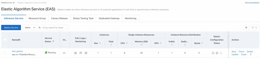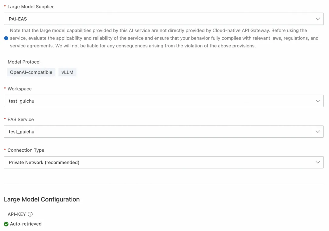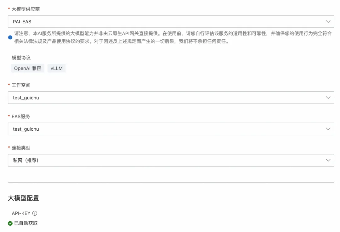 在阿里云 AI 网关新建自己的网关实例,进入服务选项卡,点击创建服务按钮,服务来源选择 AI 服务,大模型供应商选择 PAI-EAS,然后 AI 网关能够自动识别已创建的 PAI-EAS 服务,通过选择工作空间和指定的 EAS 服务,LLM API-KEY 会自动从 PAI 获取,点击确定后服务创建成功。