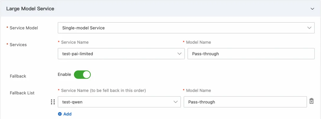 基于 Fallback 机制,实现当主用 LLM 服务不可用时兜底到备用 LLM 服务,是 AI 网关上做 LLM 服务高可用方案最基础的方式。下面以一个 AI 网关客户中最常见的用例举例:当在阿里云上自建 LLM 模型不可用时基于 AI 网关的 Fallback 机制 兜底到阿里云百炼。