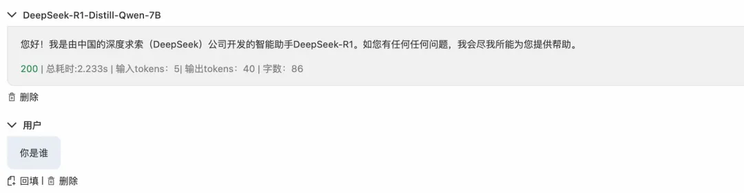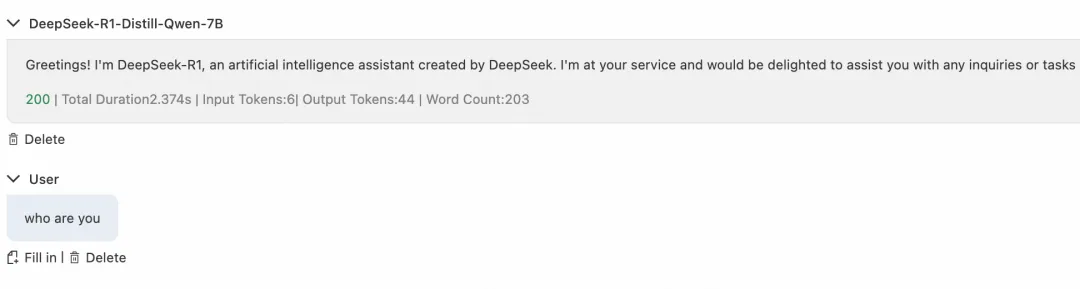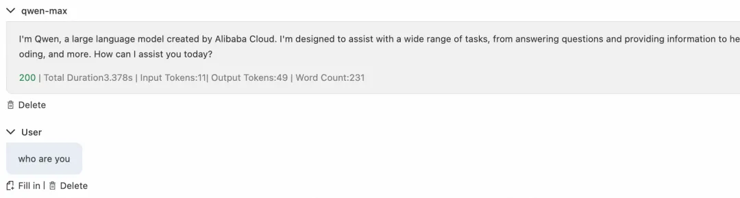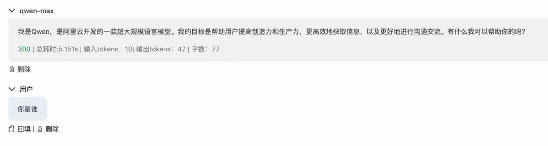 此时用户发送对话请求,由于 PAI-EAS 上部署的主服务不可用,请求自动 fallback 到备用服务百炼,返回响应中说明处理模型为 qwen,保障了服务可用性。